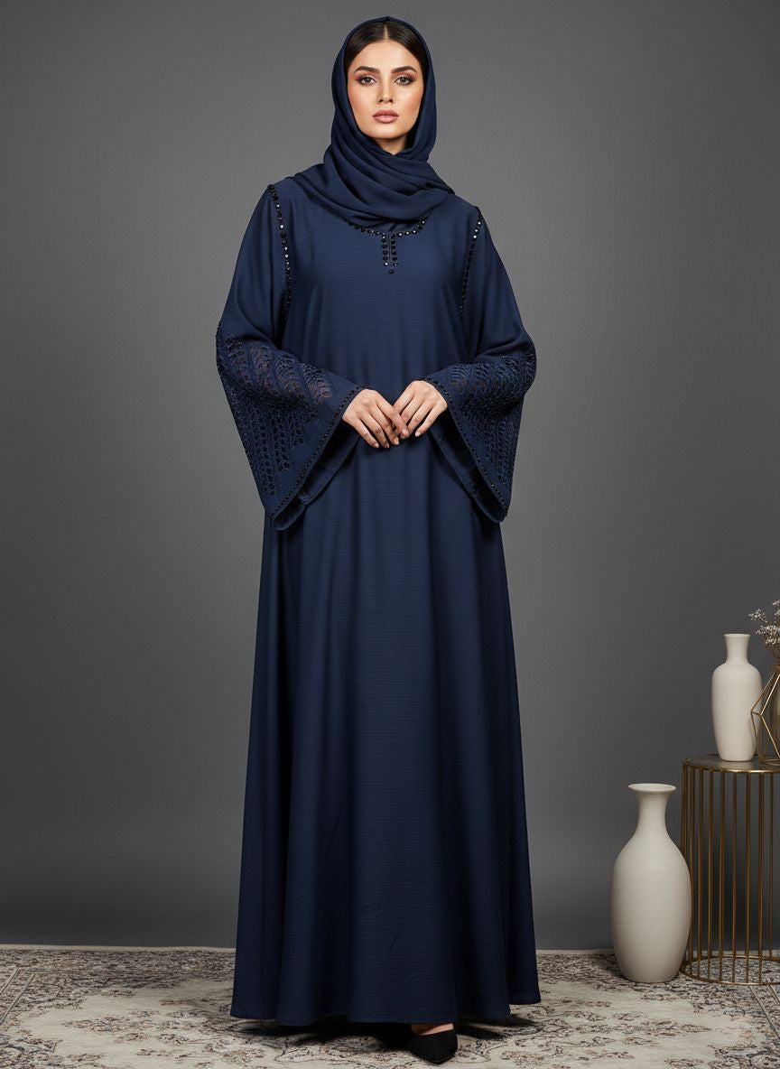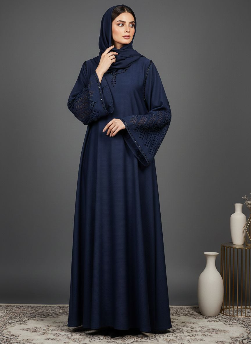 - A-line front closed maxi abaya silhouette