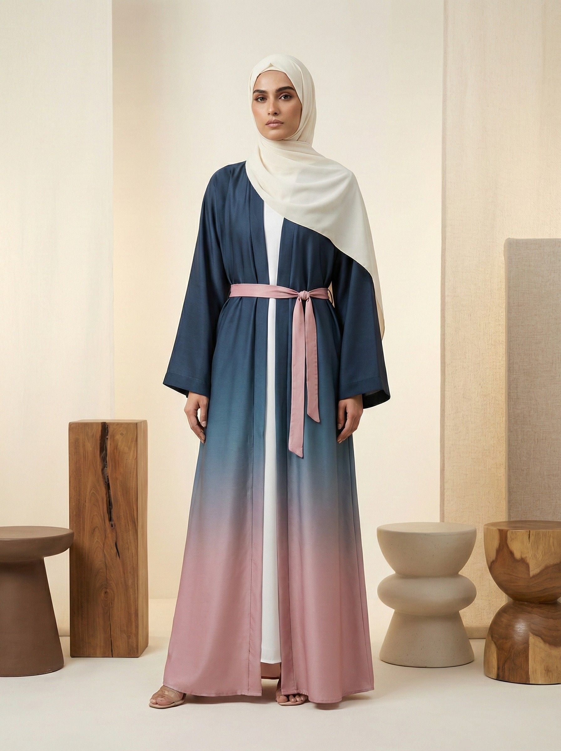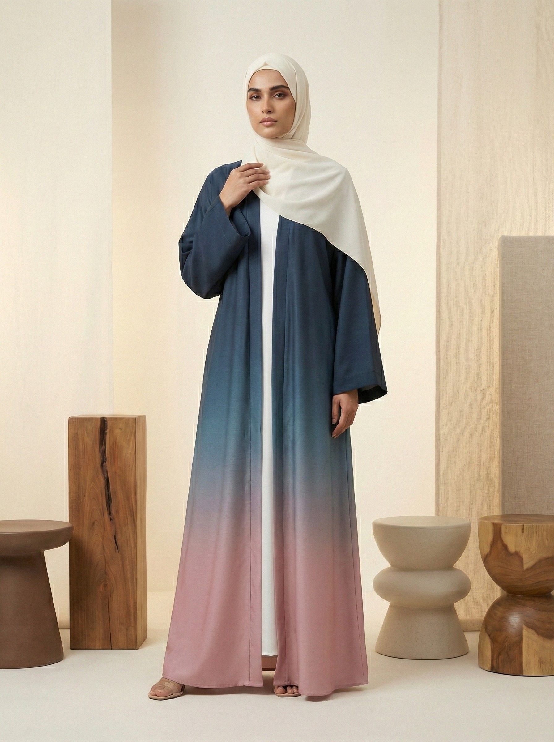 Ocean Blush is a refined kimono abaya crafted in a dual-tone, multi-layer fabric that transitions gracefully from a deep ocean blue to a soft blush hue. The fabric features a subtle sheen and textured finish, creating depth and movement with every step.